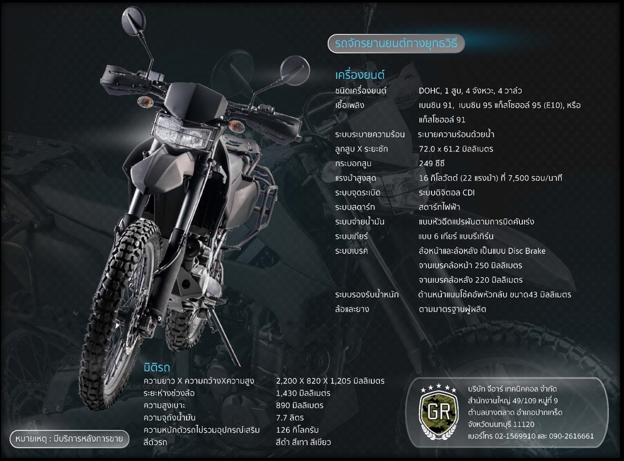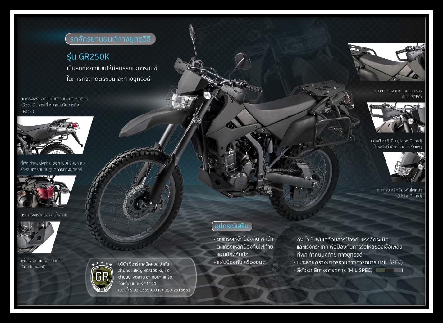 ยกระดับขีดความสามารถในการปฏิบัติภารกิจด้วย รถจักรยานยนต์ทางยุทธวิธีสมรรถนะสูง ที่ออกแบบมาเพื่อรองรับงานความมั่นคงและการบรรเทาสาธารณภัยโดยเฉพาะ ขับเคลื่อนด้วยขุมพลังเครื่องยนต์ 250cc DOHC ที่ทนทานและดูแลรักษาง่าย โดดเด่นด้านความคล่องตัวที่เหนือกว่า ยอมให้เจ้าหน้าที่เข้าถึงพื้นที่เป้าหมายหรือจุดวิกฤตได้อย่างรวดเร็วแม้ในสภาพภูมิประเทศที่ยากลำบาก หรือการจราจรที่ติดขัด พร้อมโครงสร้างที่แข็งแกร่ง รองรับการติดตั้งอุปกรณ์พิเศษเพื่อสนับสนุนทุกภารกิจสำคัญได้อย่างมีประสิทธิภาพ